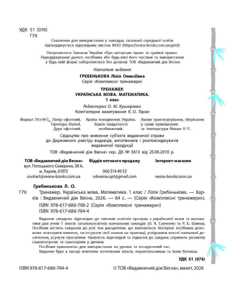 Видання складено відповідно до типових освітніх програм з української мови та математики для учнів 1 класів загальноосвітніх навчальних закладів( О.Я. Савченко та Р.Б. Шияна). Посібник містить завдання до усіх тем дісциплін, що вивчаються. Матеріал посібника допоможе поворити вивчене, застосувати свої знання на практиці, усвідомити власні навчальні досягнення, усунити прогалини. Наявніть відповідей та підказок до завдань сприяють розвитку самоконтролю та самооцінки у диини.